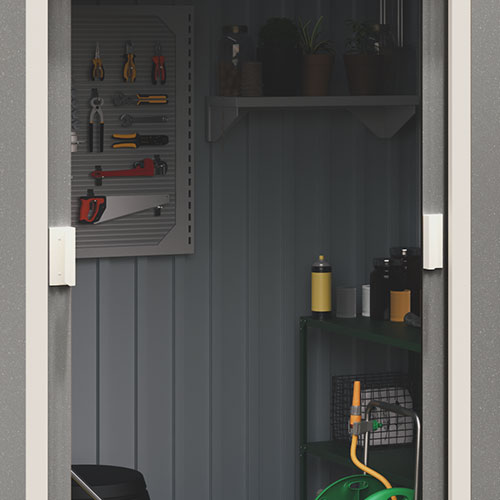 Su techo con tragaluz permite la entrada de luz natural al interior de la caseta manteniendo la privacidad de lo que guardas dentro. Además, gracias a su color de acabado metalizado se garantiza una alta protección contra los rayos UV.