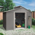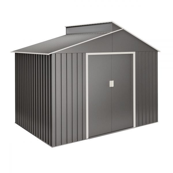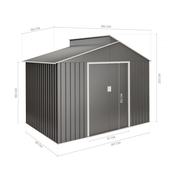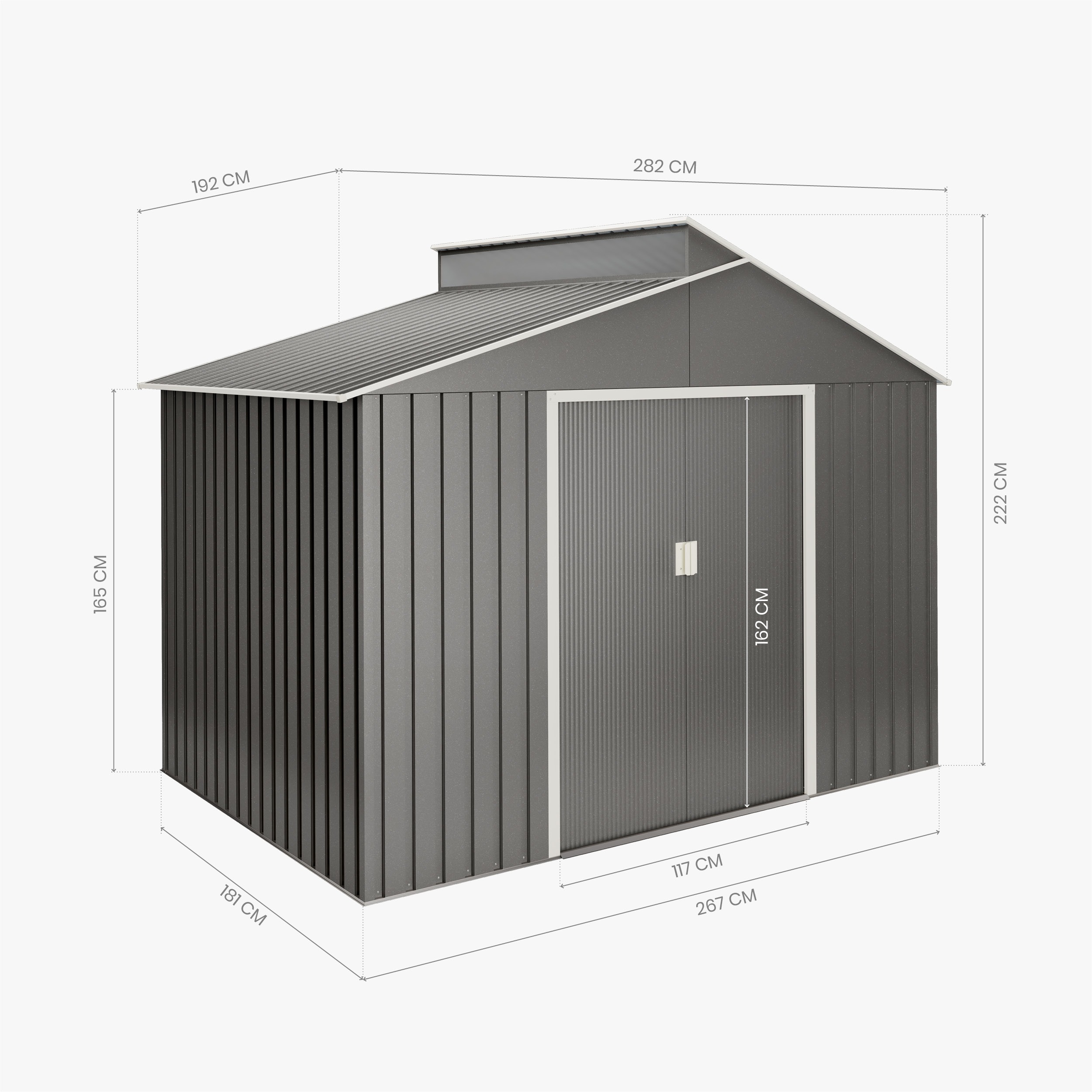 Caseta metálica de exterior con 5,44 m² de superficie, fabricada en acero galvanizado y lacada en color gris metalizado.