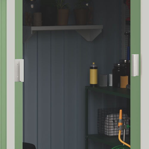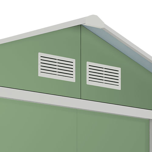 La caseta de mayor tamaño de la gama, ideal para cualquier uso, desde organización de pequeñas herramientas hasta uso como garaje. Permite convertir el espacio en una zona de taller, guardar motocicletas, barbacoas o leña. Cuenta con techo a dos aguas para facilitar la evacuación del agua, puerta corredera de fácil acceso y respiraderos para proporcionar una continua ventilación.