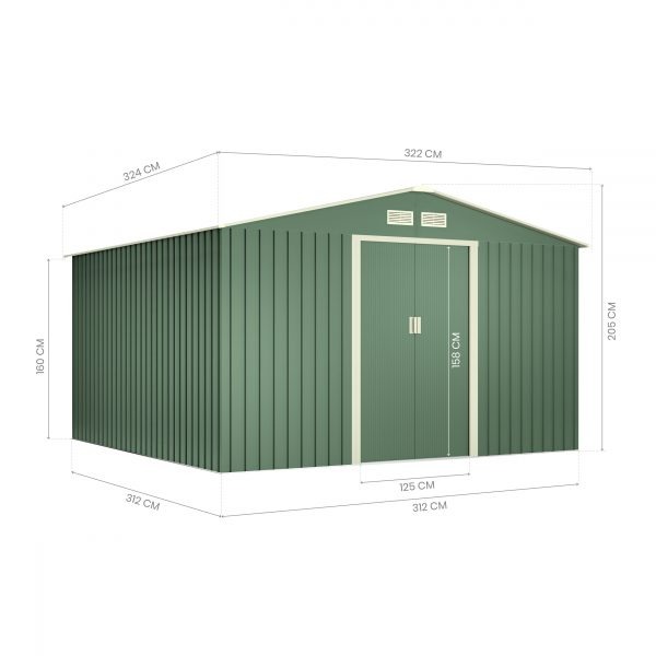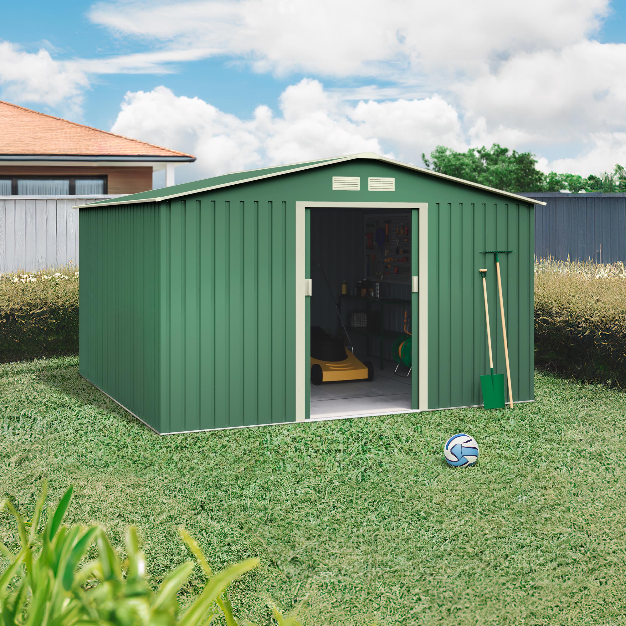 La caseta de mayor tamaño de la gama, ideal para cualquier uso, desde organización de pequeñas herramientas hasta uso como garaje. Permite convertir el espacio en una zona de taller, guardar motocicletas, barbacoas o leña. Cuenta con techo a dos aguas para facilitar la evacuación del agua, puerta corredera de fácil acceso y respiraderos para proporcionar una continua ventilación.