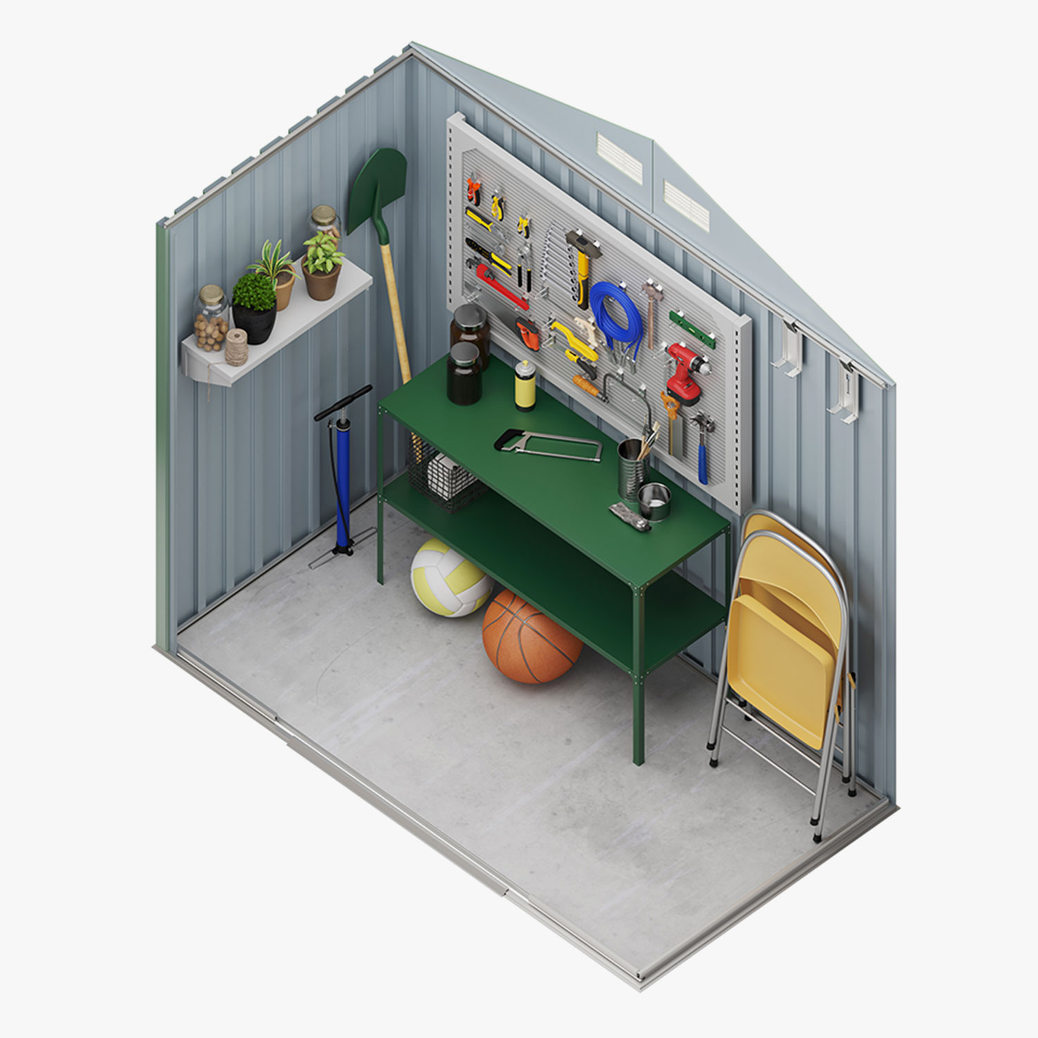 Perfecta para mantener ordenadas herramientas de mediano tamaño, mobiliario de poco volumen y accesorios de jardín como cojines, plantas, sacos de tierra u otros utensilios