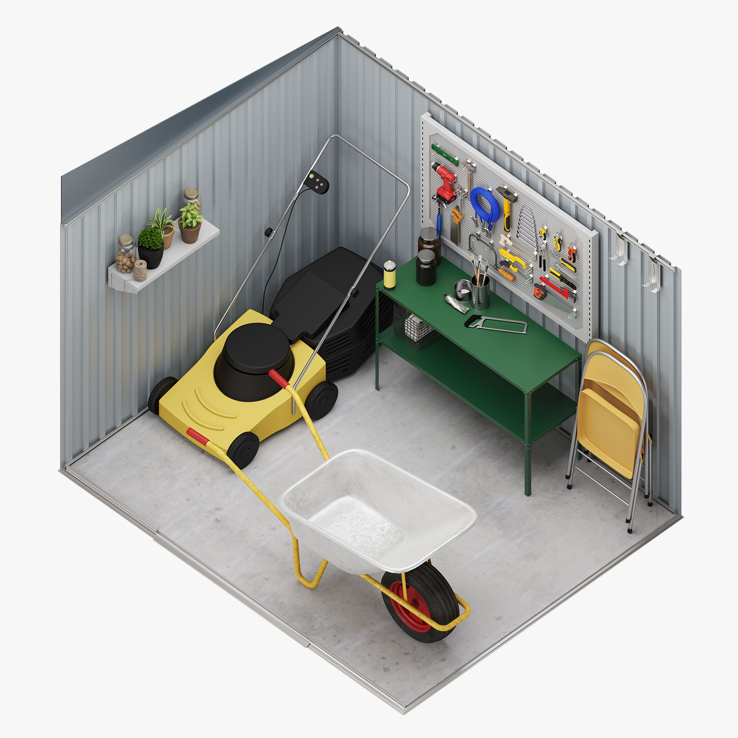 Ideal para el almacenamiento de bicicletas, utensilios de jardín, muebles, carretillas, cortacesped y demás herramientas de mediano tamaño.