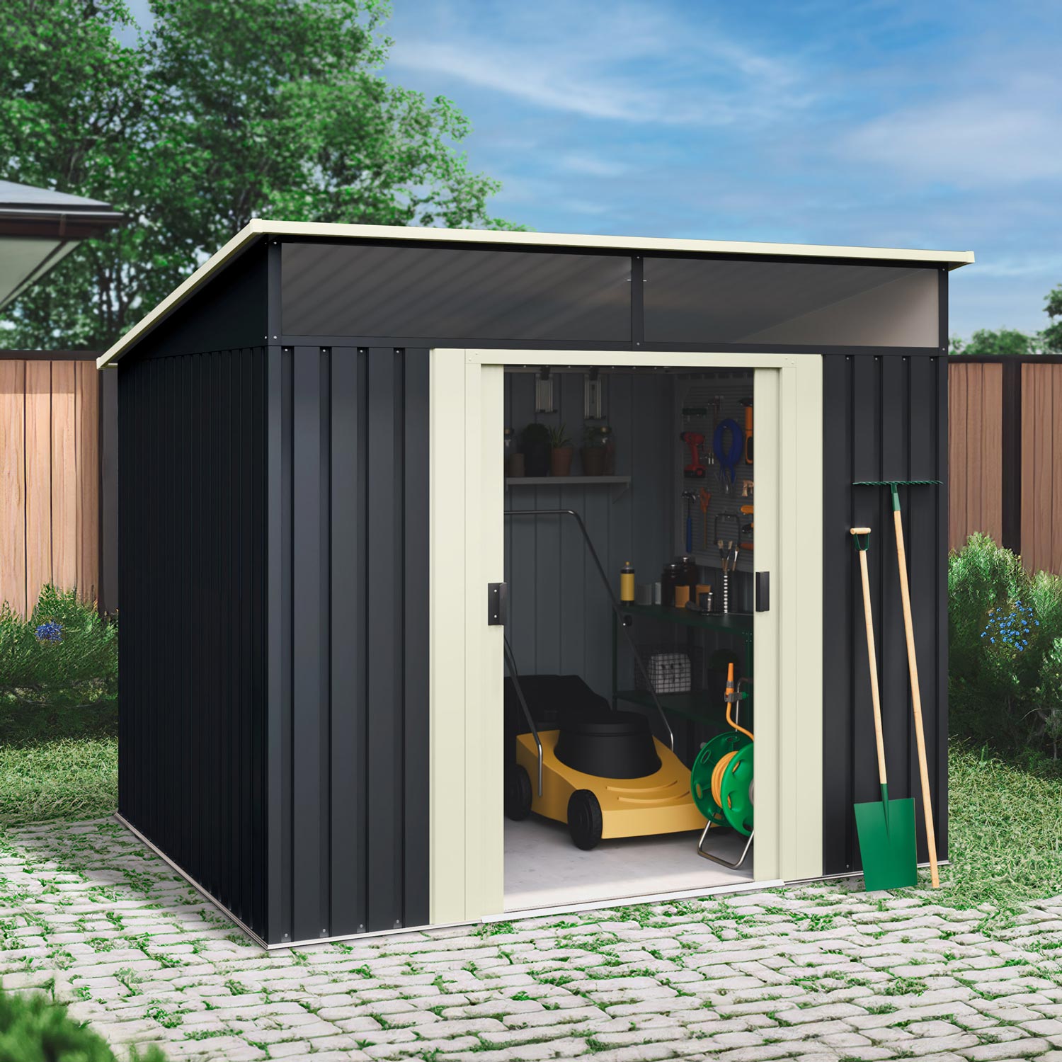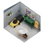 Ideal para el almacenamiento de bicicletas, utensilios de jardín, muebles, carretillas, cortacesped y demás herramientas de mediano tamaño.